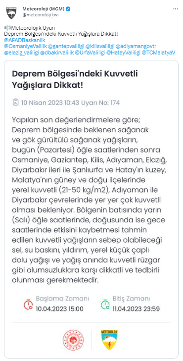 MGM’den yapılan açıklamada, “Yapılan son değerlendirmelere göre; Deprem bölgesinde beklenen sağanak ve gök gürültülü sağanak yağışların, bugün (Pazartesi) öğle saatlerinden sonra Osmaniye, Gaziantep, Kilis, Adıyaman, Elazığ, Diyarbakır illeri ile Kahramanmaraş'ın güney ve doğu, Şanlıurfa ve Hatay'ın kuzey, Malatya'nın güney ve doğu ilçelerinde yerel kuvvetli (21-50 kg/m2), Adıyaman ile Diyarbakır çevrelerinde yer yer çok kuvvetli olması bekleniyor. Bölgenin batısında yarın (Salı) öğle saatlerinde, doğusunda ise gece saatlerinde etkisini kaybetmesi tahmin edilen kuvvetli yağışların sebep olabileceği sel, su baskını, yıldırım, yerel küçük çaplı dolu yağışı ve yağış anında kuvvetli rüzgar gibi olumsuzluklara karşı dikkatli ve tedbirli olunması gerekmektedir.” denildi.