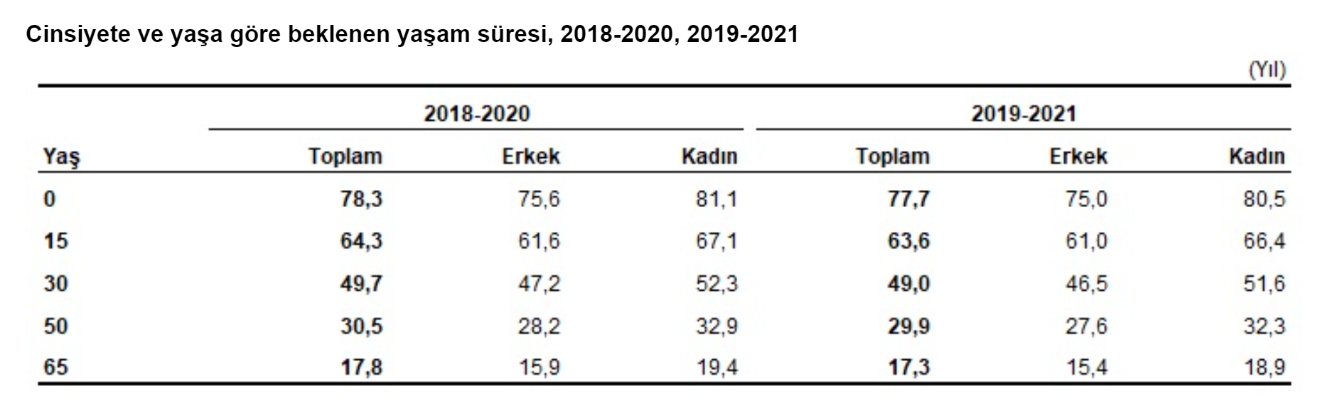 Türkiye'de 2018-2020 döneminde erkeklerde 75,6 yıl olan doğuşta beklenen yaşam süresi, 2019-2021 döneminde 75 yıl, kadınlarda ise 81,1 yıl iken 80,5 yıl oldu. Genel olarak kadınlar erkeklerden daha uzun süre yaşamakta olup, erkekler ve kadınlar arasındaki doğuşta beklenen yaşam süresi farkı 5,5 yıldır.