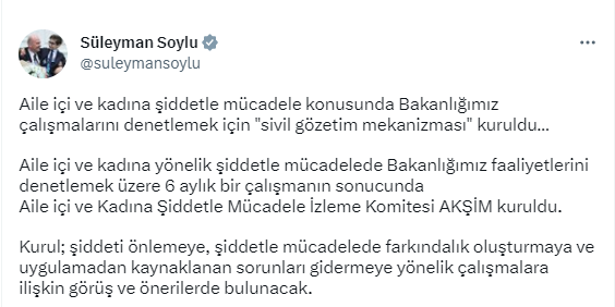 “Aile içi ve kadına şiddetle mücadele konusunda Bakanlığımız çalışmalarını denetlemek için ‘sivil gözetim mekanizması’ kuruldu. Aile içi ve kadına yönelik şiddetle mücadelede Bakanlığımız faaliyetlerini denetlemek üzere 6 aylık bir çalışmanın sonucunda Aile içi ve Kadına Şiddetle Mücadele İzleme Komitesi (AKŞİM) kuruldu. Kurul; şiddeti önlemeye, şiddetle mücadelede farkındalık oluşturmaya ve uygulamadan kaynaklanan sorunları gidermeye yönelik çalışmalara ilişkin görüş ve önerilerde bulunacak.”