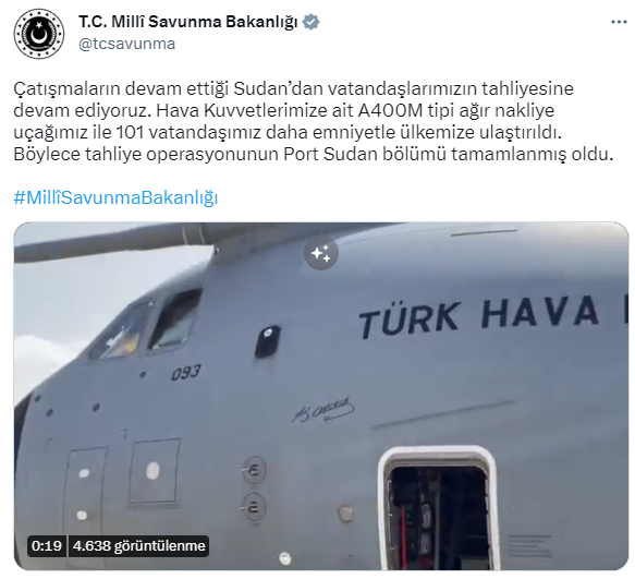 "Çatışmaların devam ettiği Sudan’dan vatandaşlarımızın tahliyesine devam ediyoruz. Hava Kuvvetlerimize ait A400M tipi ağır nakliye uçağımız ile 101 vatandaşımız daha emniyetle ülkemize ulaştırıldı. Böylece tahliye operasyonunun Port Sudan bölümü tamamlanmış oldu."