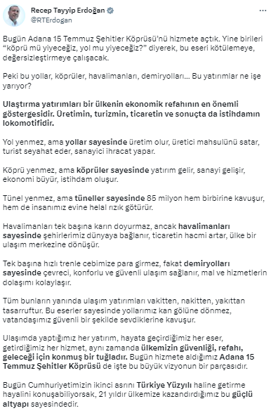 Bugün hizmete aldığımız Adana 15 Temmuz Şehitler Köprüsü de işte bu büyük vizyonun bir parçasıdır. Bugün Cumhuriyetimizin ikinci asrını Türkiye Yüzyılı haline getirme hayalini konuşabiliyorsak, 21 yıldır ülkemize kazandırdığımız bu güçlü altyapı sayesindedir."