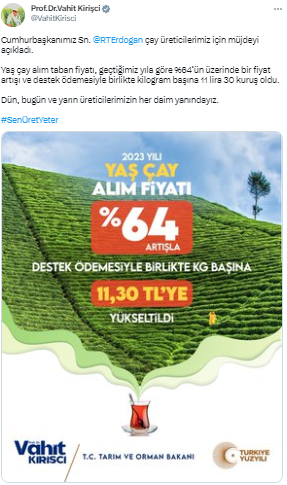 Bakan Kirişçi, sosyal medya hesabından yaptığı açıklamada, "Cumhurbaşkanımız Sn.Recep Tayyip Erdoğan çay üreticilerimiz için müjdeyi açıkladı. Yaş çay alım taban fiyatı, geçtiğimiz yıla göre %64’ün üzerinde bir fiyat artışı ve destek ödemesiyle birlikte kilogram başına 11 lira 30 kuruş oldu. Dün, bugün ve yarın üreticilerimizin her daim yanındayız." ifadesini kullandı.