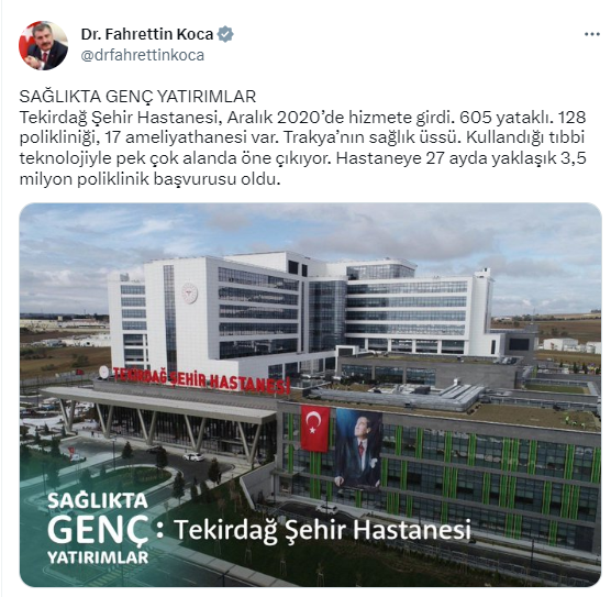 “Sağlıkta gen? yatırımlar. Tekirdağ Şehir Hastanesi, Aralık 2020’de hizmete girdi. 605 yataklı. 128 polikliniği, 17 ameliyathanesi var. Trakya’nın sağlık ?ss?. Kullandığı tıbbi teknolojiyle pek ?ok alanda ?ne ?ıkıyor. Hastaneye 27 ayda yaklaşık 3,5 milyon poliklinik başvurusu oldu.”