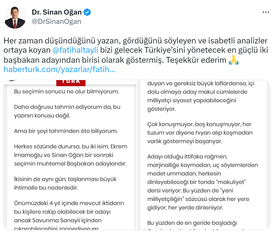 "Her zaman d?ş?nd?ğ?n? yazan, g?rd?ğ?n? s?yleyen ve isabetli analizler ortaya koyan Fatih Altaylı, bizi gelecek T?rkiye’sini y?netecek en g??l? iki başbakan adayından birisi olarak g?stermiş. Teşekk?r ederim."
