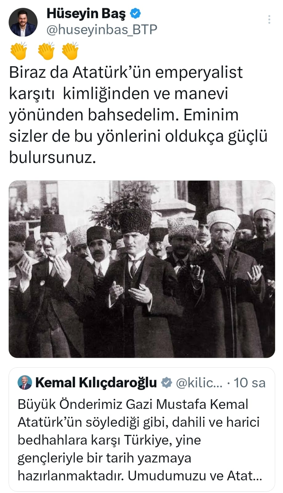 Kılıçdaroğlu’nun “Büyük Önderimiz Gazi Mustafa Kemal Atatürk’ün söylediği gibi, dahili ve harici bedhahlara karşı Türkiye, yine gençleriyle bir tarih yazmaya hazırlanmaktadır. Umudumuzu ve Atatürk’ün gençlere verdiği tarihsel görevi diri tutarak, kararlılıkla yürüyeceğiz” paylaşımını alkışlayarak alıntılayan BTP lideri kendi mesajında da şu ifadeleri kullandı;