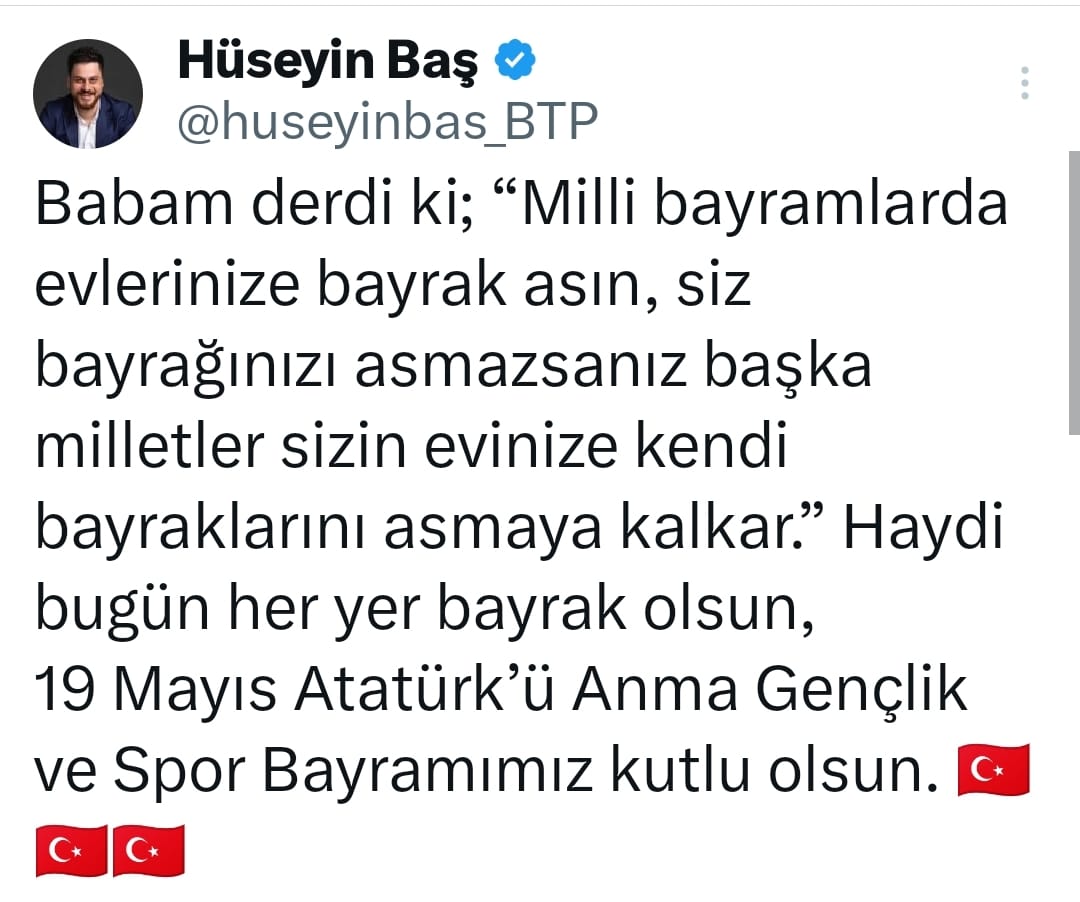 BTP Genel Başkanı Hüseyin Baş twitter hesabından yaptığı paylaşımda da 19 Mayıs’ı kutladı.