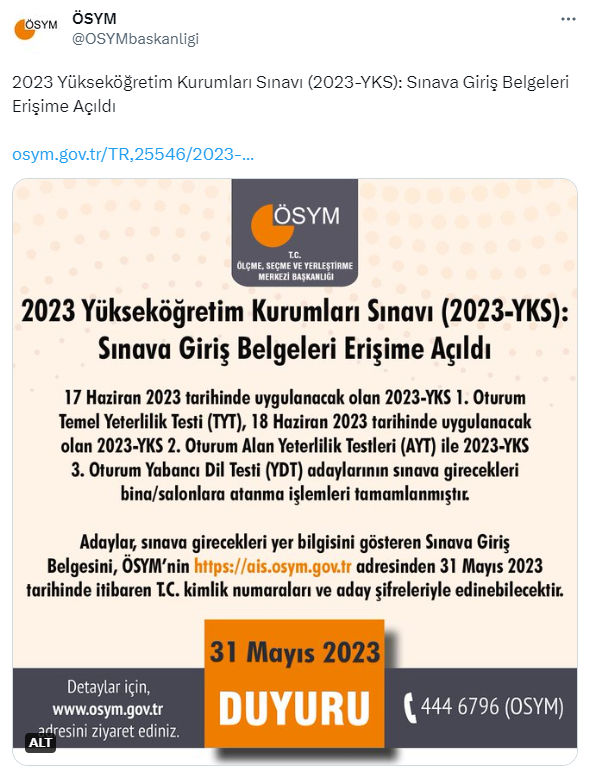 “17 Haziran 2023 tarihinde uygulanacak olan 2023-YKS 1. Oturum Temel Yeterlilik Testi (TYT), 18 Haziran 2023 tarihinde uygulanacak olan 2023-YKS 2. Oturum Alan Yeterlilik Testleri (AYT) ile 2023-YKS 3. Oturum Yabancı Dil Testi (YDT) adaylarının sınava girecekleri bina/salonlara atanma işlemleri tamamlanmıştır. Adaylar, sınava girecekleri yer bilgisini g?steren Sınava Giriş Belgesini, ?SYM’nin https://ais.osym.gov.tr ?adresinden 31 Mayıs 2023 tarihinde saat 15.00'ten itibaren T.C. kimlik numaraları ve aday şifreleriyle edinebilecektir.”