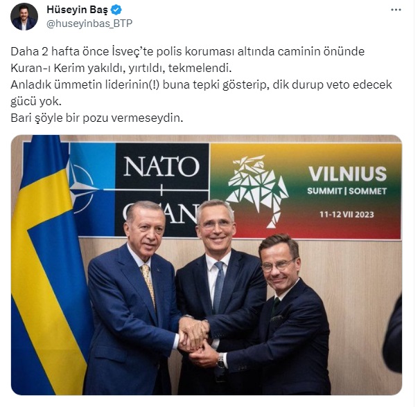 Hüseyin Baş bir başka paylaşımında ise, “Yeni dönem hükümetin dış politikadaki ilk zaferi İslam düşmanı, terör destekçisi, Türk düşmanı İsveç’i NATO’ya kabul etmek diyebilir miyiz?” ifadelerini kullandı.