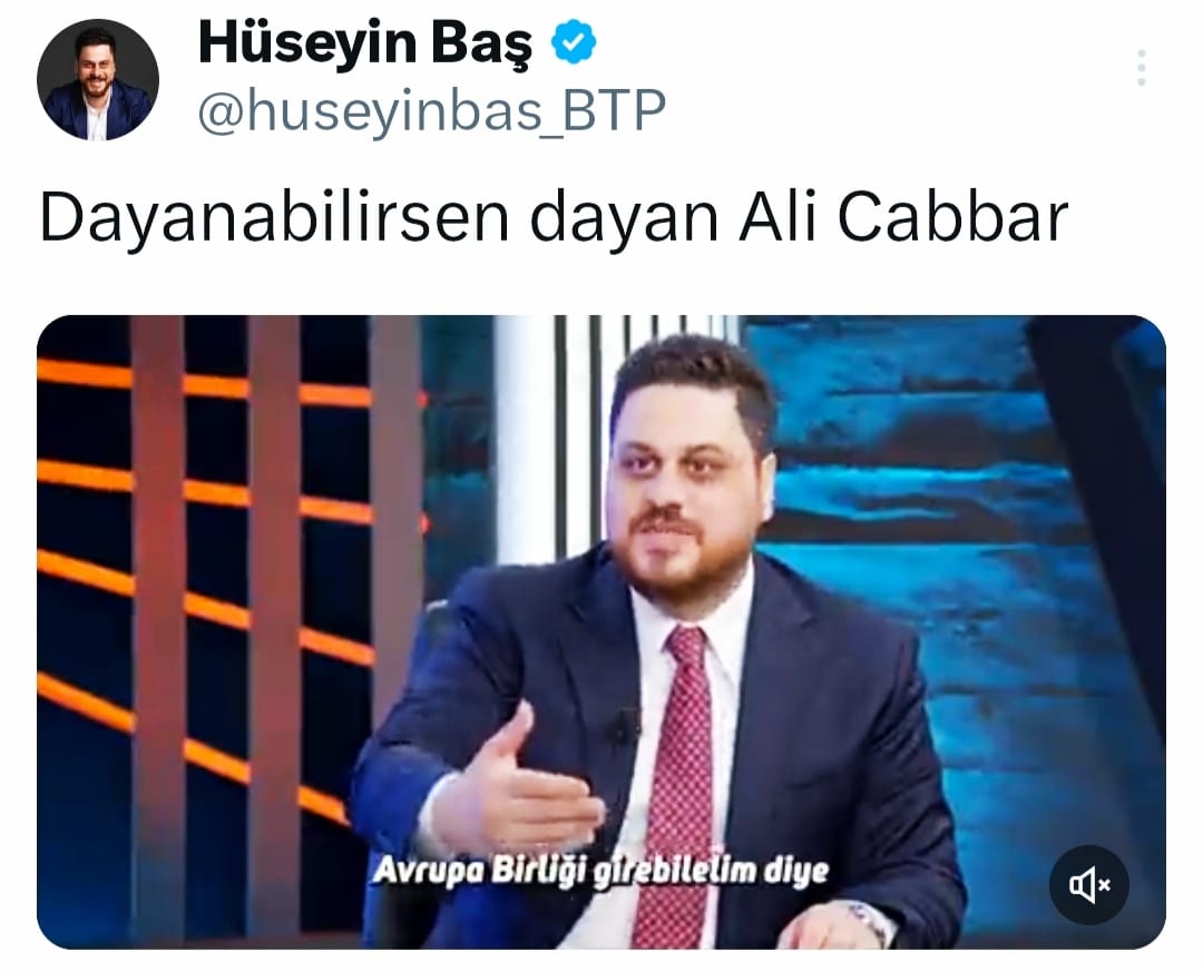 AKP iktidarının Avrupa Birliği ısrarını kız isteme örneğiyle anlatan BTP lideri, “Hani bir kızı istemeye gider adamın biri. Bir kere gider kızı vermezler, adam anlamaz ikinciye gider der ki, 'Çikolatayı eksik getirmişiz' yine vermezler. Üçüncüye gider yine vermezler, ama elli sefer evine gidip istediğinde kızı sana vermiyorlarsa olay artık dayanabilirsen dayan Ali Cabbar'a döner. Yani vermiyorlar sana bu kızı işte. Daha neyi zorluyorsun ki, ne almaya çalışıyorsun? Nitekim Avrupa Birliği'nin bu durumdan haberi bile yok. Hatta Avrupa Birliği yarın çıkıp şunu diyebilir; ‘Ben ne alaka kanka! Siz NATO'da ne yapıyorsanız yapın. Beni ne karıştırıyorsun?" diyebilirler.