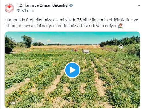 Bakanlığın sosyal medya hesabından yapılan açıklamada “İstanbul’da üreticilerimize azami yüzde 75 hibe ile temin ettiğimiz fide ve tohumlar meyvesini veriyor, üretimimiz artarak devam ediyor.” ifadesi kullanıldı.