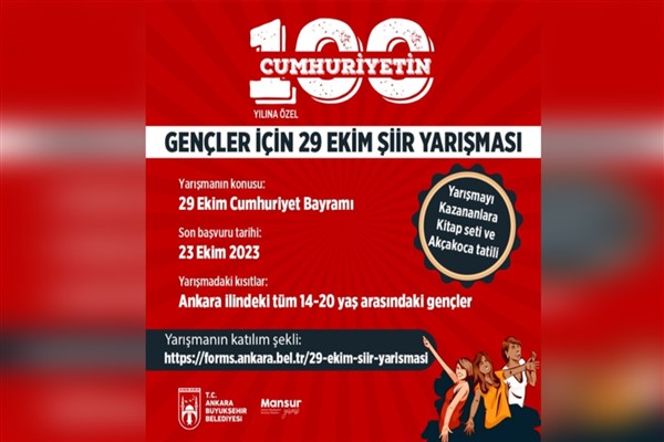 Ankara’da yaşayan gençlerin sanata teşvik edilmesi amacıyla düzenlenen 29 Ekim Cumhuriyet Bayramı temalı şiir yarışmasında; katılımcılara ait şiirler dil, üslup, anlatım ve estetik yönünden değerlendirilecek ve 6 kazanan belirlenecek.