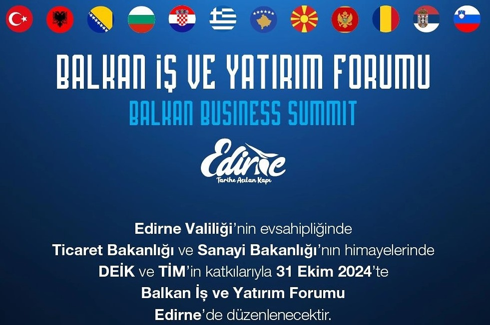 Balkan ülkeleri ile iş birliğini güçlendirmeyi ve kalıcı ortaklıklar sağlamayı hedefleyen Balkan Şehirleri İş Birliği Platformu’nun faaliyetleri çerçevesinde, T.C. Edirne Valiliği ev sahipliğinde, T.C. Ticaret Bakanlığı ve T.C. Sanayi ve Teknoloji Bakanlığı himayelerinde, DEİK ve Türkiye İhracatçılar Meclisinin destekleriyle 31 Ekim 2024 tarihinde Balkan İş ve Yatırım Forumu düzenlenecek.