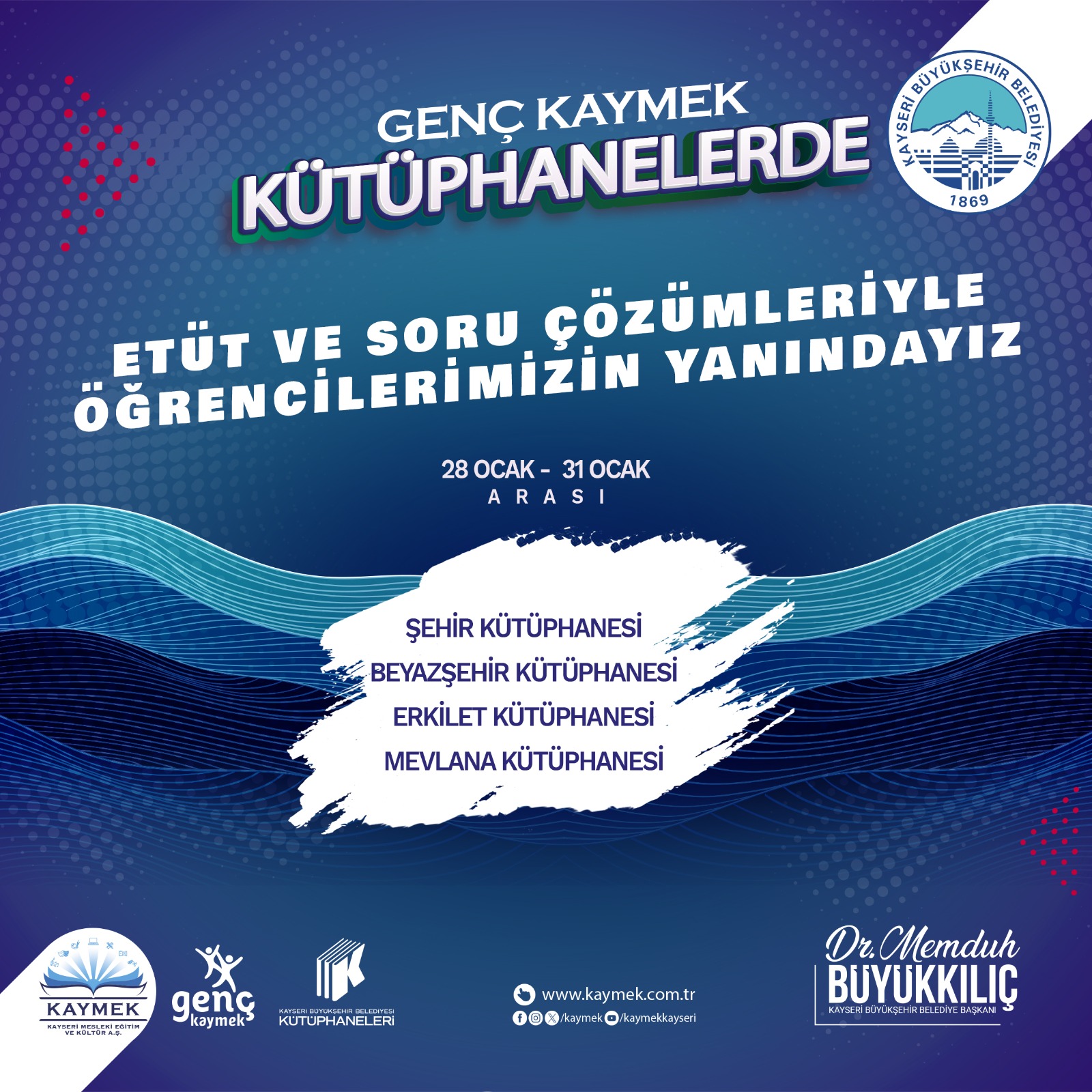 Genç KAYMEK birimi tarafından düzenlenen “Etüt ve soru çözümleri” Büyükşehir Belediyesi bünyesinde hizmet veren Şehir Kütüphanesi, Beyazşehir Kütüphanesi, Erkilet Kütüphanesi ve Mevlana Kütüphanesi’nde başladı.