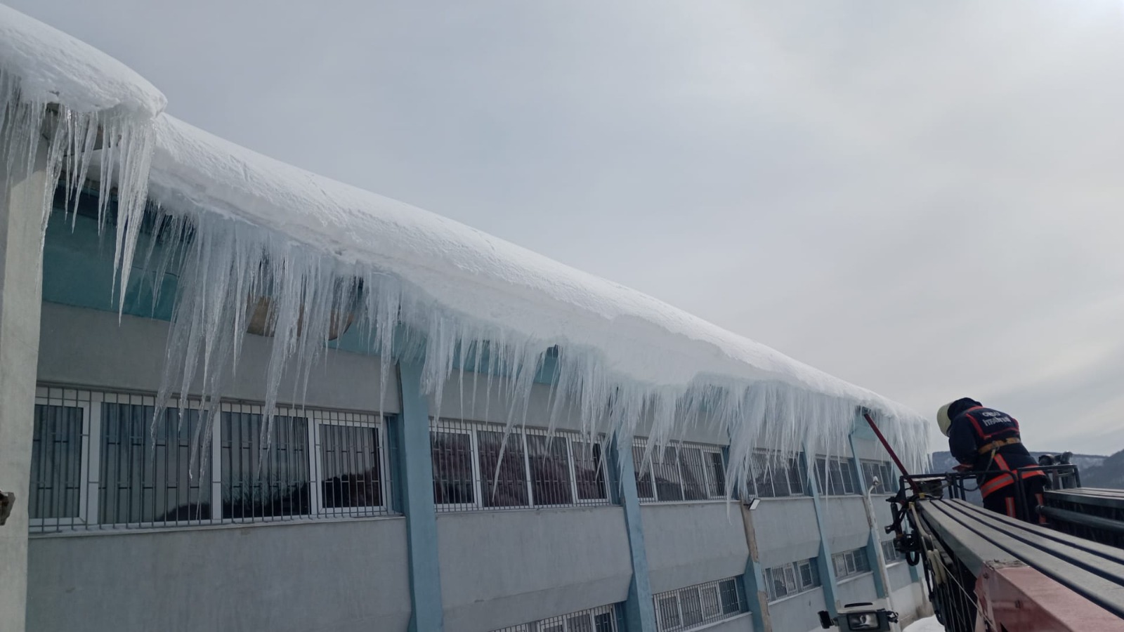 Eğitim faaliyetlerinin devam ettiği okullar başta olmak kamu kurumları ve vatandaşların yoğun olarak kullandığı güzergahtaki binaların çatıları ekipler tarafından temizleniyor.