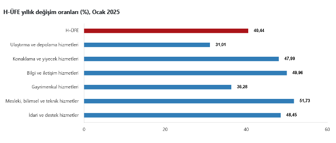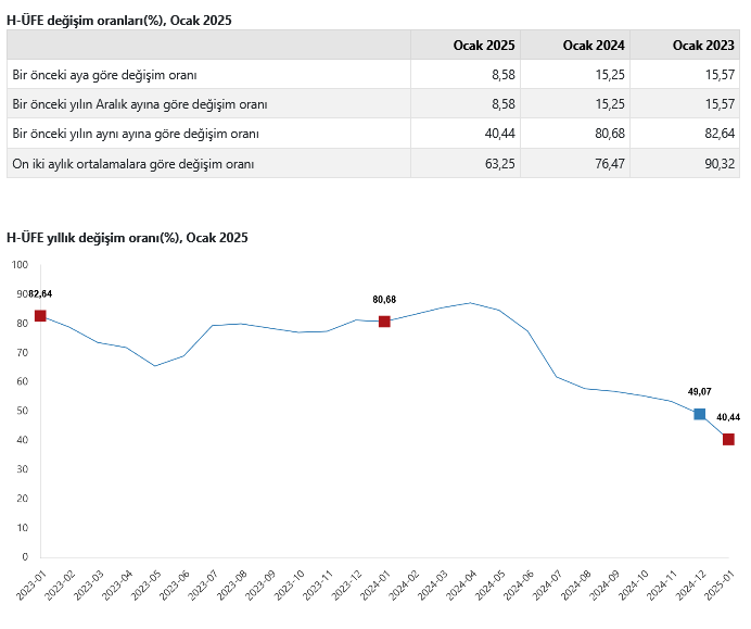 Türkiye İstatistik Kurumu’nun verilerine göre, H-ÜFE 2025 yılı Ocak ayında bir önceki aya göre yüzde 8,58 artış, bir önceki yılın Aralık ayına göre yüzde 8,58 artış, bir önceki yılın aynı ayına göre yüzde 40,44 artış ve on iki aylık ortalamalara göre yüzde 63,25 artış gösterdi.