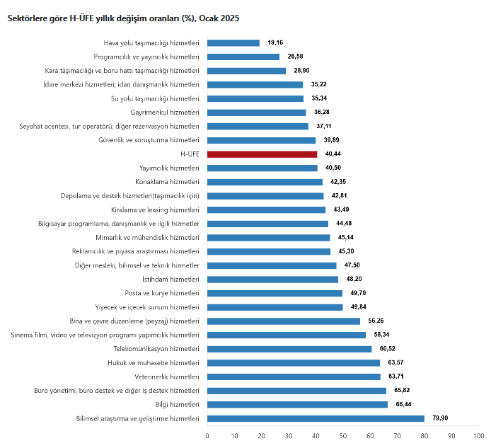 Bir önceki aya göre, ulaştırma ve depolama hizmetlerinde yüzde 5,75 artış, konaklama ve yiyecek hizmetlerinde yüzde 7,90 artış, bilgi ve iletişim hizmetlerinde yüzde 7,09 artış, gayrimenkul hizmetlerinde yüzde 7,25 artış, mesleki, bilimsel ve teknik hizmetlerde yüzde 15,68 artış, idari ve destek hizmetlerde yüzde 14,13 artış gerçekleşti.