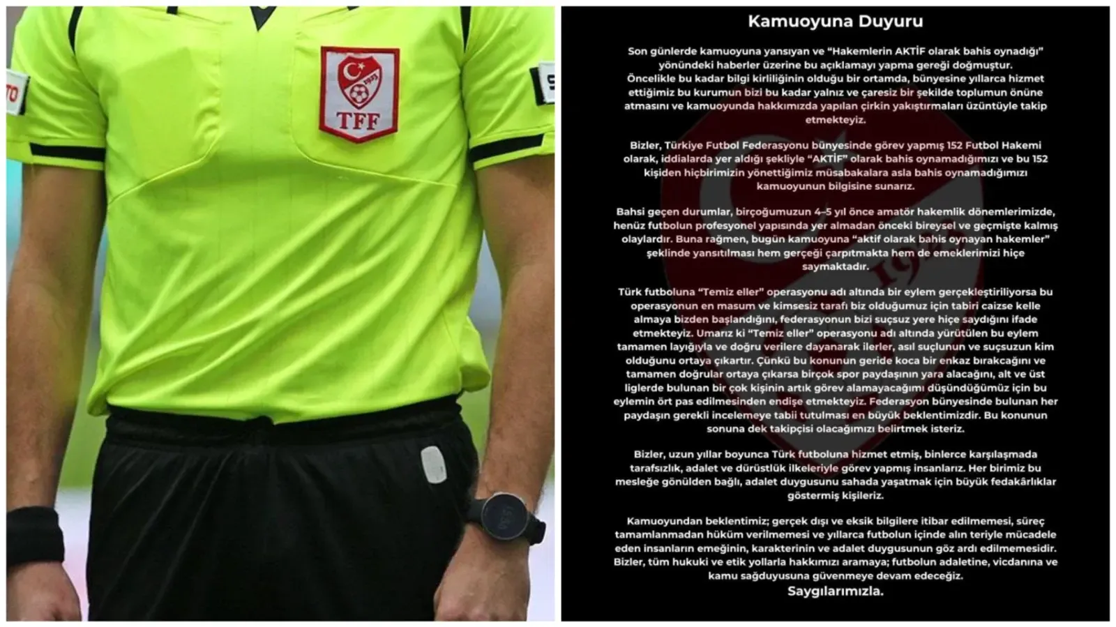 “Bizler, Türkiye Futbol Federasyonu bünyesinde görev yapmış 152 futbol hakemi olarak, iddialarda yer aldığı şekliyle aktif olarak bahis oynamadığımızı ve hiçbirimizin yönettiğimiz müsabakalara bahis yapmadığımızı kamuoyunun bilgisine sunarız.”
