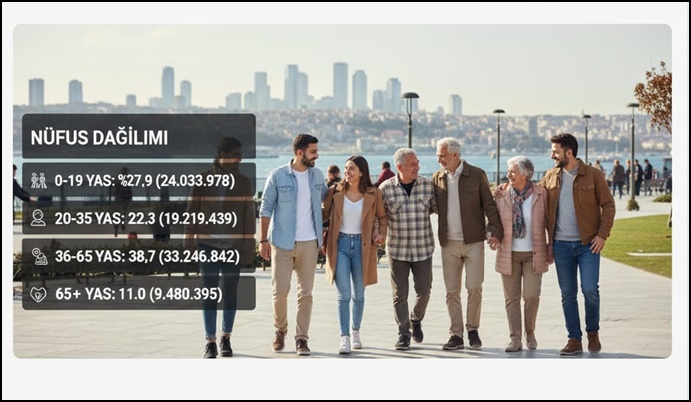 20–35 yaş grubunda 19 milyon 219 bin 439 kişi yer alırken, bu kesimin oranı %22,3 olarak kaydedildi.