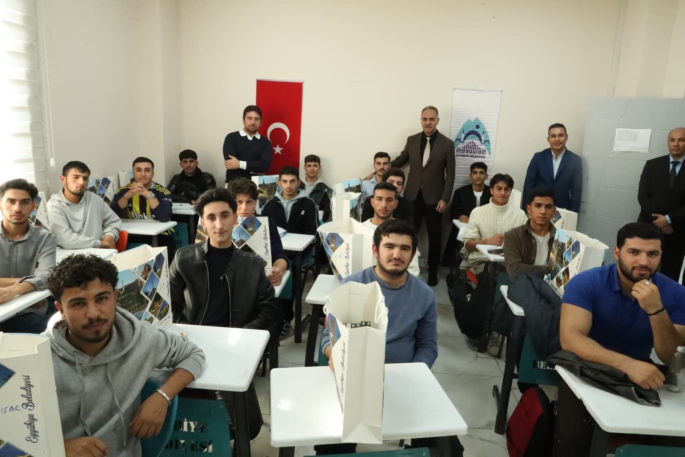 Eyyübiye Belediye Başkanı Mehmet Kuş, Başkan Yardımcısı Necmeddin Sağlam ile birlikte Süleymanşah Gençlik Merkezi’nde üniversite sınavlarına hazırlanan öğrencilerle bir araya geldi. Sınıfları ziyaret ederek gençlerle sohbet eden Başkan Kuş, öğrencilere eğitim seti hediye etti. Ayrıca gençlere halı saha maçı ve gezi sözü veren Başkan Kuş, Kur’an Kursu’na devam eden ve 20 gün içinde Kur’an-ı Kerim okumayı başaracak çocuklara tablet bilgisayar dağıtılacağını açıkladı.