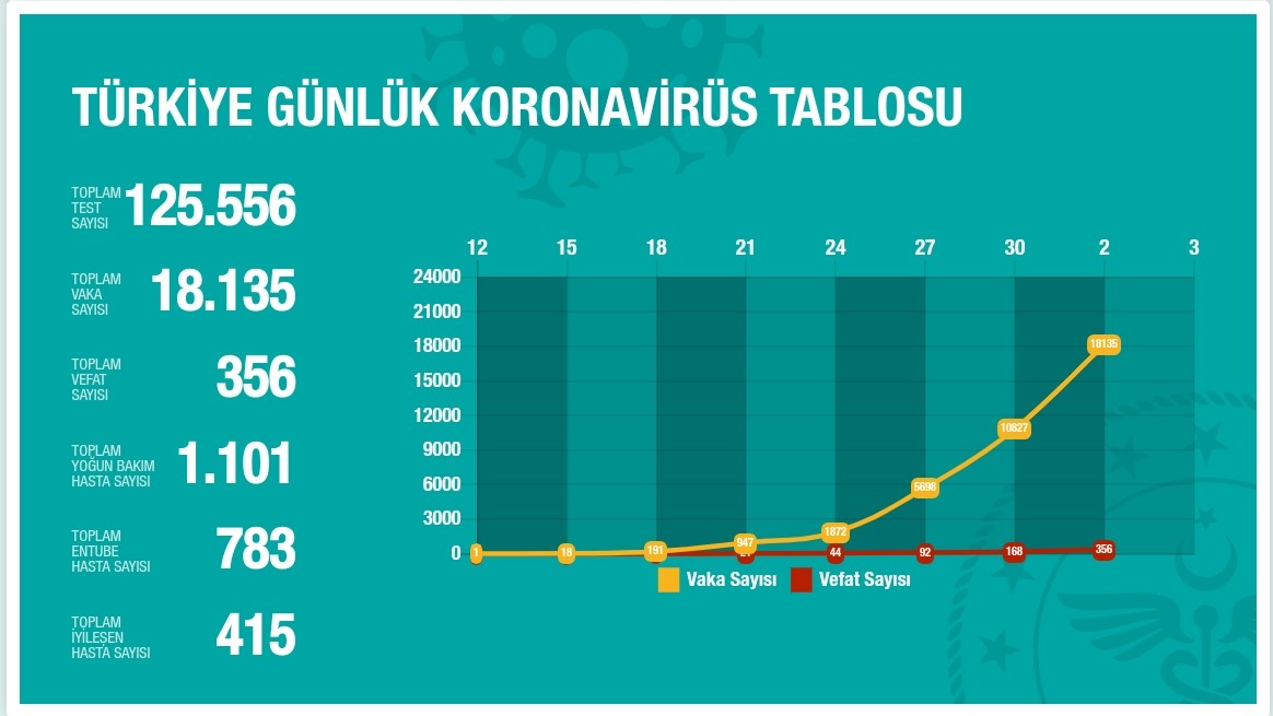 Bugün itibariyle toplam test sayısının 125 bin 558, toplam vaka sayısının 18 bin 135 olduğunu açıklayan Koca, koronavirüsten ölenlerin sayısının da 79 artarak 356’ya yükseldiğini belirtti.