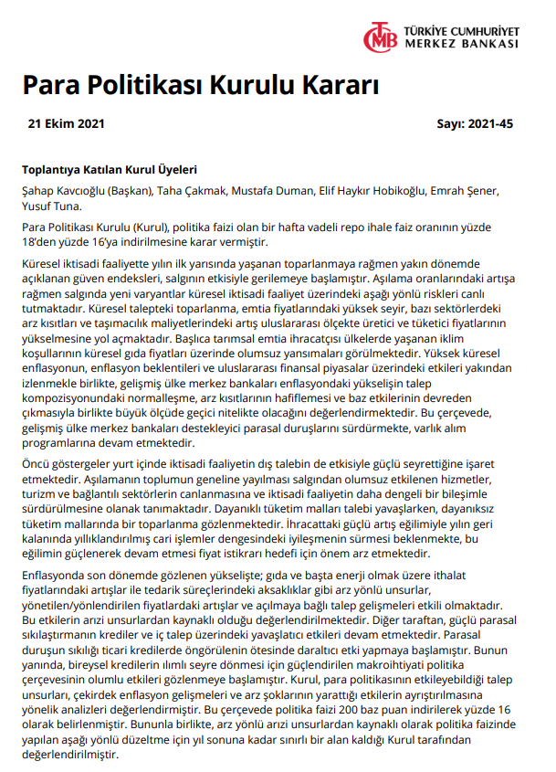TCMB, 200 baz puan faiz indirimine giderek politika faizini %18 seviyesinden %16 seviyesine çekmiştir.