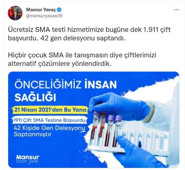 Konuyla ilgili olarak sosyal medya üzerinden açıklamalarda bulunan Ankara Büyükşehir Belediye Başkanı Mansur Yavaş, “Ücretsiz SMA testi hizmetimize bugüne dek 1.911 çift başvurdu. 42 gen delesyonu saptandı. Hiçbir çocuk SMA ile tanışmasın diye çiftlerimizi alternatif çözümlere yönlendirdik” ifadelerini kullandı.