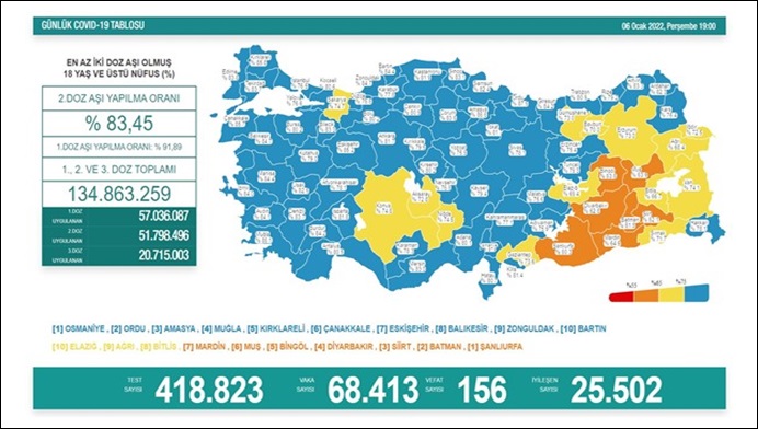 Sağlık Bakanlığından yapılan açıklamaya göre, 06 Ocak'ta 418 bin 823 test yapıldı. Vaka sayısı 68 bin 413 oldu, 156 kişi hayatını kaybederken, 25 bin 502 kişi iyileşti. Ülke genelinde 2. doz aşı yapılma oranı yüzde 83,45 olarak gerçekleşti.
