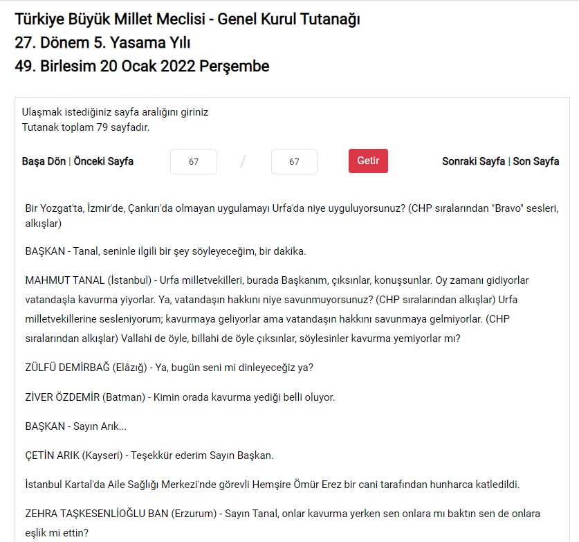 CHP’li vekil Mahmut Tanal, konuşmasını şöyle sürdürdü: “Şanlıurfa milletvekilleri, burada Başkanım, çıksınlar, konuşsunlar. Oy zamanı gidiyorlar vatandaşla kavurma yiyorlar. Ya, vatandaşın hakkını niye savunmuyorsunuz? Urfa milletvekillerine sesleniyorum; kavurmaya geliyorlar ama vatandaşın hakkını savunmaya gelmiyorlar. Vallahi de öyle, billahi de öyle çıksınlar, söylesinler kavurma yemiyorlar mı?”