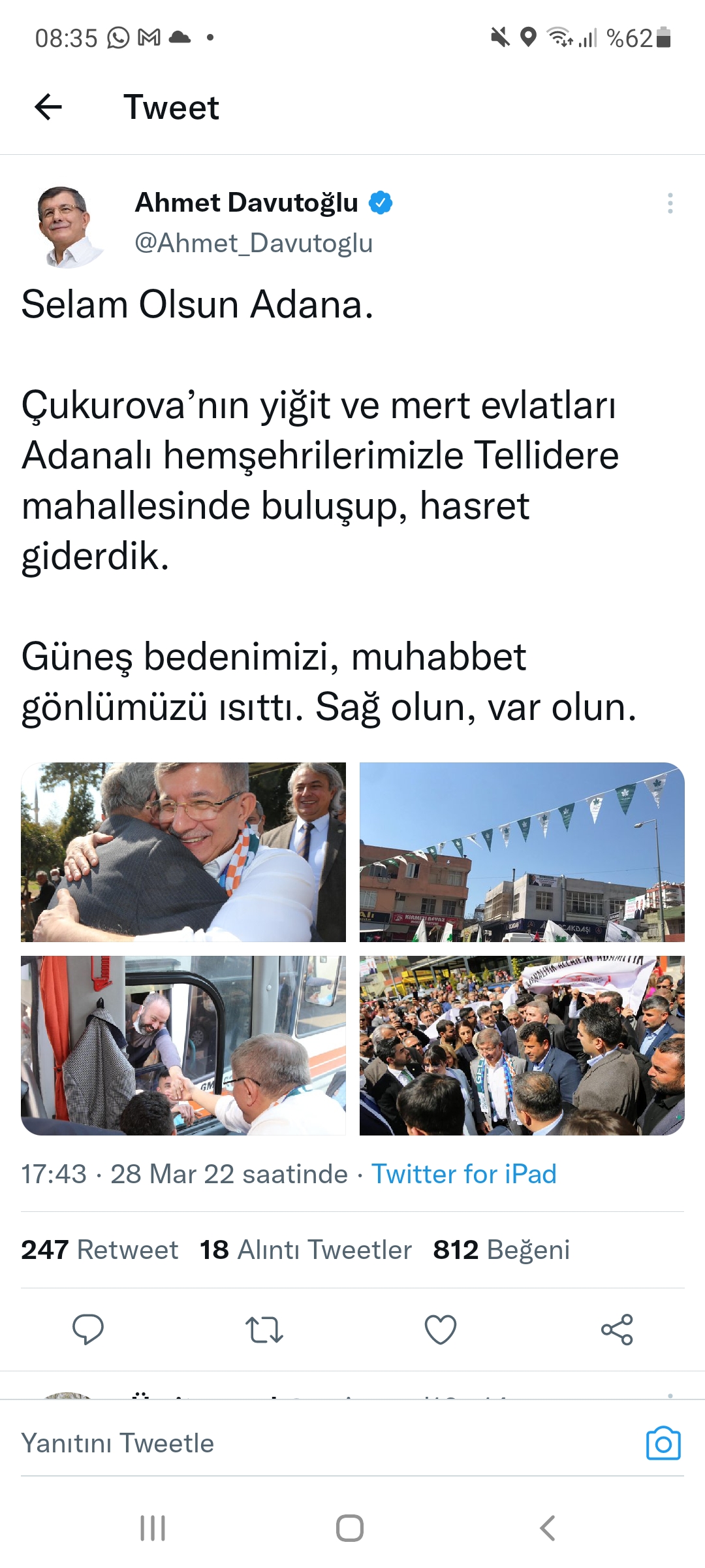 Uzunca süredir bu ziyarete hazırlandıklarını söyleyen Gelecek Partisi Adana İl Başkanı Ebubekir Yıldırım Adanalıların Davutoğlu’na gösterdikleri ilgi nedeniyle oldukça sevinçli olduklarını ve hemşerilerinin bu teveccühünden dolayı gurur duyduklarını belirtti