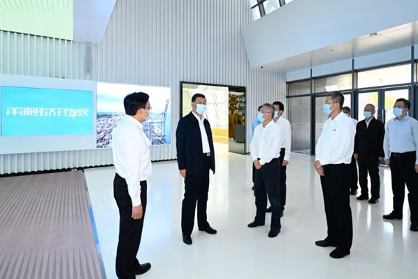 Xi, Yangpu Sergi Salonu ve Yangpu Uluslararası Konteyner Limanı’nın Xiaochantan İskelesi’nde incelemelerde bulundu. Xi, Yangpu Ekonomik Kalkınma Bölgesi’nin gelişmesi ve Çin’e özgü serbest ticaret limanının inşası hakkındaki gelişmelerle ilgili bilgi edindi.