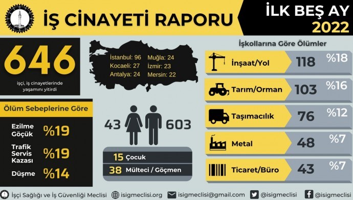 İş Sağlığı ve İşçi Meclisi Güvenliği (İSİG), 2022 yılının ilk 5 aylık iş cinayeti raporunu yayımladı. Rapora göre, ilk 5 ayda 646 işçi, iş cinayetinde yaşamını yitirdi. Bu rakamın içindeki kadın işçi sayısı ise 43.