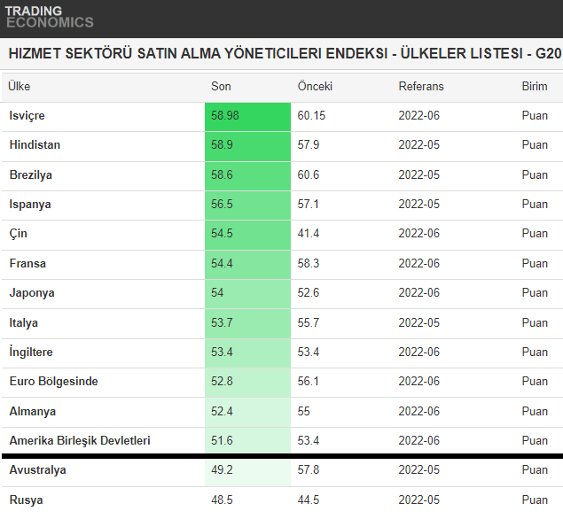 Tabloyu dikkatlice incelediğimizde Rusya ve Avustralya referans seviyesi altında daralma bölgesinde yer almakla birlikte listenin en iyi performansı İsviçre’den gelmektedir. Son dönemde PMI tarafında gelen gerileme ile birlikte Büyüme tarafındaki endişelerin oldukça dikkat çektiği bir ortamda yeni dönemde hem İmalat hem de Hizmet sektörüne gelecek PMI verileri dikkatle takip edilmelidir. Ek olarak tradingeconomics kaynak olarak aldığımız tablodaki veri sonuçlarının bazılarının Mayıs, bazıların ise Haziran ayına denk geldiği (bakınız referans sütunu) göz ardı edilmemelidir.