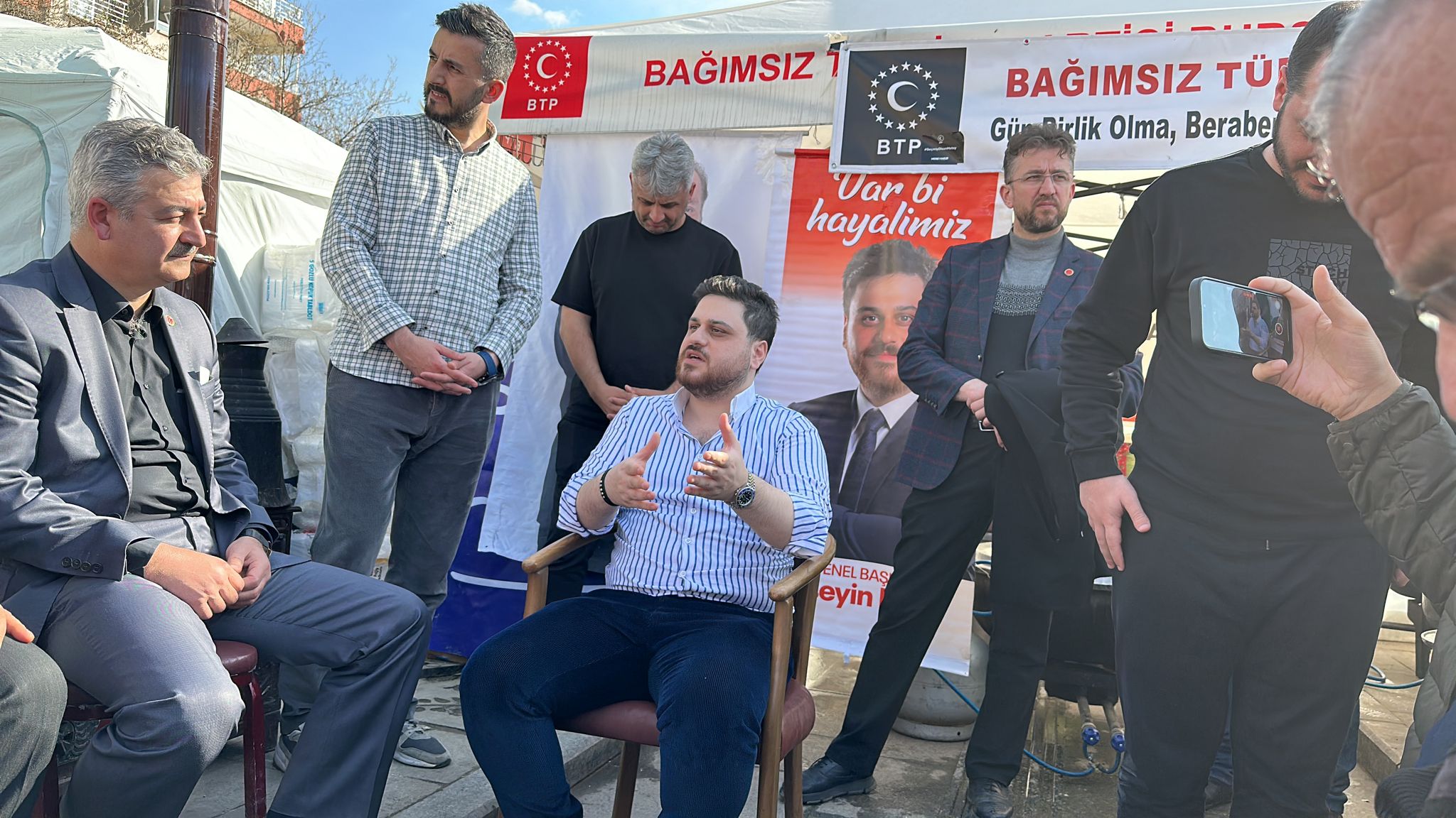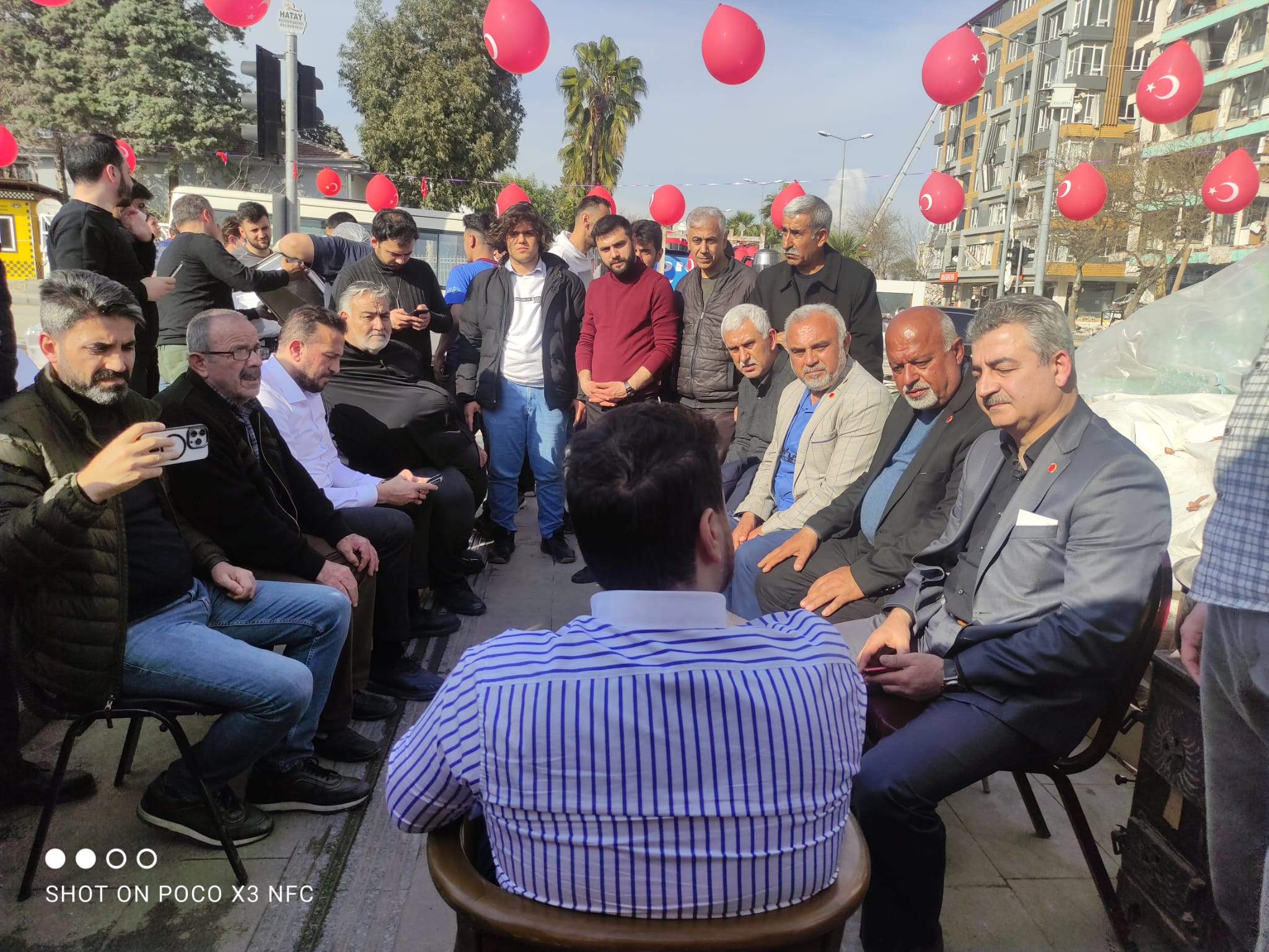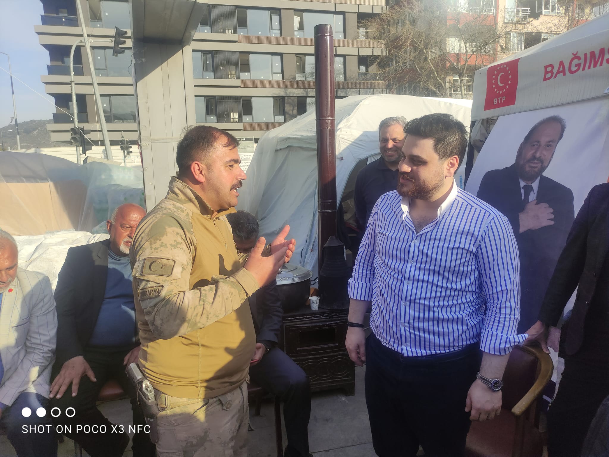 Osmaniye ziyaretinin ardından Hatay’a geçen BTP lideri, burada depremin hemen ardından kurulan BTP çadır yemekhanesinin önünde vatandaşlarla sohbet etti.